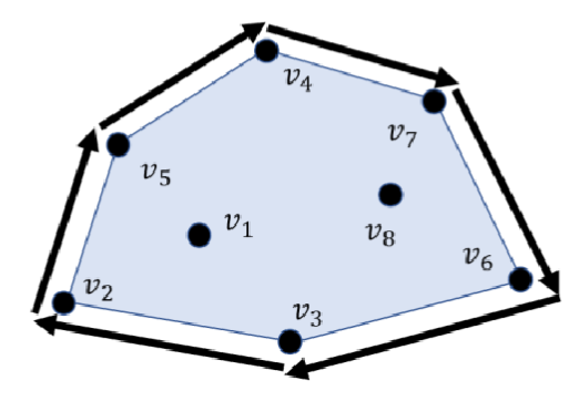 Given a point set, , the convex hull, , is a convex polygon such that comprises a subset of arranged in a clockwise order and that all points in are included in or on the edge of the polygon. Below is an example.