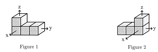 Let us consider representing an orientation of an object in a three-dimensional space as a rotation from a canonical orientation. In the following, we consider the orientation of the object consisting of four cubes as shown in Figures 1 and 2 (note that each pair of cubes placed side by side shares a surface). We also define the canonical orientation as the one illustrated in Figure 1. Note that the center of the cube at the lower left in Figure 1 is placed at the origin, and the center of each cube lies on the axis. Figure 2 shows another orientation of this object, in which the center of the cube at the lower right is placed at the origin, and the center of each cube lies on the axis. When you draw another orientation of this object, you need to draw it with the axes from the same point of view as Figures 1 and 2. Angles must be represented in radian.